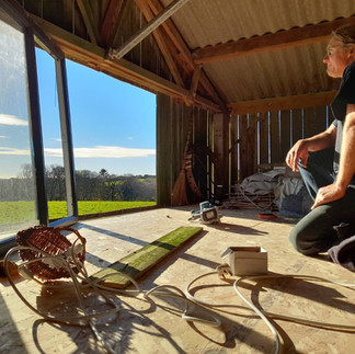 So here goes. Does my studio story begin in the bedroom of my shared house in Bristol where I was doing a psychology degree? or when I had a dream about a life change and adventured by bus to an art foundation course in Weston -Super -Mare?, Was it in the garage of the Winchester's Friends Quaker meeting house?, or the lounge of a shared house which was also a band practice room with practising band? Was it the Malvern hills where I learned colour mixing from an artist friend painting Plein air or Brighton beach where a stranger commissioned a house full of paintings which enabled me to stop my care work and be a full time artist for the first time? Was it my university cubicle in Cheltenham where I returned as a mature student to study painting and drawing or under the stairs next to the canteen? Was it the bedroom in one shared house, the garage in the next or the house sit? Was it the spare room of the cottage of my dreams that I rented in the Forest of Dean or the barn used for drying hops at the back of my gallery in Herefordshire? Was it the roof top terrace in Bohd gaya India where I painted a whole collection of paintings to be sent back to a gallery in a drainpipe or the abandoned village in the mountains in Italy where I painted on our honeymoon? Was it the back of our mark 1 Ford transit campervan travelling around Portugal, the goat shed we bought in the foothills of the Serra Da Estrella where we had to take tiles off the roof to let the light in? Was it the bell tent, down by the waterfall which was our temporary home whilst we made the goat shed habitable? or the spare room as the goat shed turned into a family home where I'd wear the babies on my back as I painted and worked for 7 years? Does my studio story start when the wildfires ravaged our home in 2017 and took the entirety of our belongings including the materials, all the art work and sketchbooks I'd ever done? or in the rented studio in the nearest village I'd walk to through the carcases of burnt olive groves, where I painted nothing but flowers? does it start in the lounge of my mothers rental, or the spare room of her next one? does it start in the 400 year old derelict farm project we collectively bought with 4 other families back in Cornwall, UK? Does it start in the grade 2 listed house, abandoned for 12 years, trees growing from the inside out, that Mr husband made windows for so I could paint under it's new roof, accessed only by a ladder, where lime dust would fly into the room and settle on oil paintings? Does it start in the barn, where I escaped the lime dust, which for centuries had only been inhabited by cows. Does it start in the yurt, erected on the hardstanding that was laid in the barn, after the poo was dug out or the structure that followed on the second floor as mr husband built and built? Does it start with the new window that was cut into the wooden slats that poured in the Southern sun with a view of fields and gentle, grazing cows? Was it the carpet and the plants, and the shelves and the changing seasons I watch through the window. Was it the settling, the sitting, the unpacking, the processing? The continuous moving of colour through changing scenes. Was it in the joys and the sorrows that make up life's wonderful ongoing painting. Or maybe where it started isn't the question but rather 'what is the studio?'